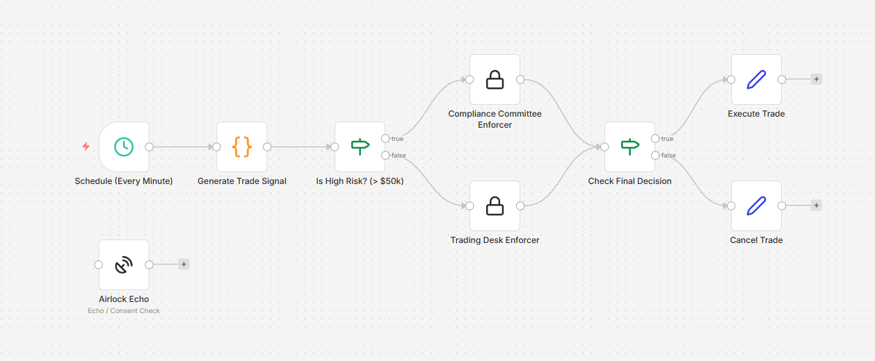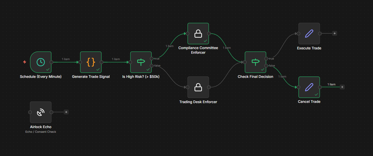 The upstream README includes a full algorithmic trading desk example: scheduled trigger, connectivity/consent check, randomized signals, branching by risk, two enforcer nodes with different action presets, and final execute/cancel branches. The workflow is provided as JSON you can paste into n8n to import the graph.